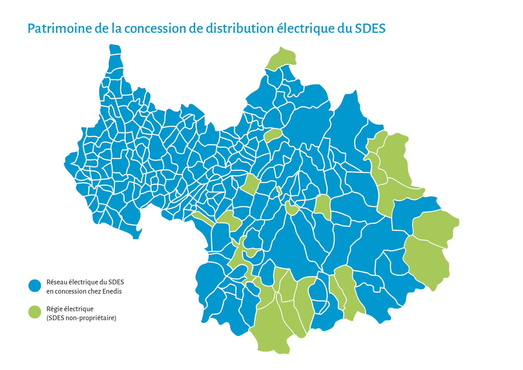 En 1996 les communes transfèrent leur compétence et leur patrimoine au SDES. L’objectif étant de se rassembler au sein d’une collectivité unique (à l’exception des régies électriques). Mais également de signer un contrat unique avec le concessionnaire obligé, désigné par l’Etat : Enedis (anciennement EDF puis ERDF).